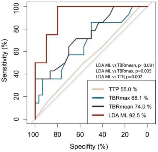 ROC plot. The AUC is lowest for TTP (55.0%), followed by TBRmax (68.1%) and TBRmean (74.0%). The highest AUC is reached using the LDA ML model (92.5%) and is significantly different from that of TBRmax (p = 0.035) and TTP (p = 0.002).