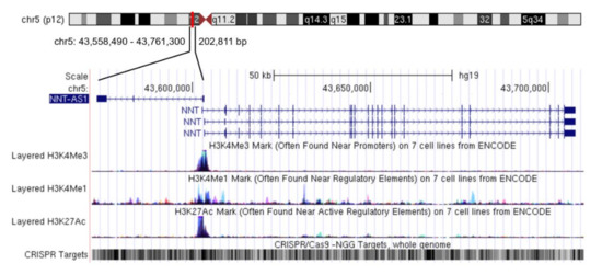 Genome position of long non-coding RNA (lncRNA) nicotinamide nucleotide transhydrogenase-antisense 1 (NNT-AS1). NNT-AS1 is mapped to chromosome 5. Reference information comes from the University of California Santa Cruz (UCSC) Genome Browser (http://genome.ucsc.edu/).