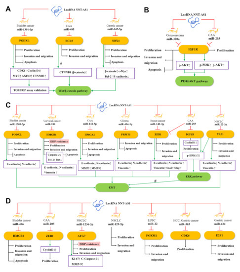 As one of the most classic signaling pathways, the Wnt signaling pathway plays a key role in the occurrence, maintenance, and development of many cancers. Among them, the Wnt/β–catenin pathway mainly regulates the fate of cells during development [48]. As shown in Figure 2A, a study found that in bladder cancer, NNT-AS1 can up-regulate podocalyxin-like (PODXL) by sponging miR-1301-3p, which in turn activates the Wnt pathway-related proteins, including CDK1, cyclin D1, MYC, AXIN2, and CTNNB1 (β-catenin) [29]. In CAA, the up-regulated NNT-AS1 can compete with miR-485 to bind to B-cell CLL/lymphoma 9 protein (BCL9), thereby increasing the expression of BCL9 and promoting the proliferation, migration, and invasion of CCA cells [22]. BCL9 was found to be involved in the regulation of the Wnt/β–catenin pathway [49,50]. In addition, Zhang et al. found in GC cells that NNT-AS1 can regulate the expression of sex-determining region Y-related high-mobility-group-box transcription factor 4 (SOX4) through sponging miR-142-5p, while knockdown of NNT-AS1 will reduce β-catenin, c-Myc, and Bcl-2 but enhance e-cadherin expression. Knockdown of miR-142-5p and overexpression of SOX4 can reverse this performance, indicating that NNT-AS1 may activate the Wnt/β–catenin signaling pathway through the miR-142-5p/SOX4 axis, and then induce the proliferation, migration, invasion, and apoptosis inhibition of GC cells [35].
