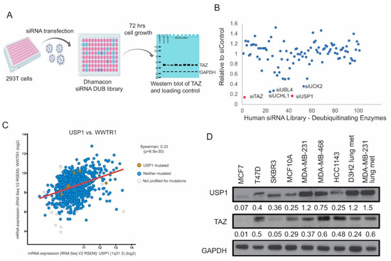 We employed an siRNA screen targeting genome-wide DUB enzymes to understand how deubiquitinating enzymes alter TAZ protein levels in vitro. The TAZ-expressing construct was co-transfected with the Dharmacon siRNA DUB library in HEK293T cells. The siControl or siTAZ served as negative or positive control. Protein lysates were collected 72 h post-transfection and exogenous TAZ expression was detected by immunoblot (Figure 1A). We found that the knockdown of several DUBs such as, USP1, UCK2, UBL4A and UCHL1 dramatically reduced TAZ protein levels (Figure 1B). Using TCGA data, we found that USP1 and TAZ significantly co-occurred in the TNBC cases, while the other DUBs had a less significant co-occurrence (USP1:WWTR1 OR = 2.958, p < 0.001; UCK2:WWTR1 OR = 1.605, p < 0.001; UBL4A:WWTR1 OR = 1.123, p < 0.013; UCHL1:WWTR1 OR = 1.497, p < 0.009) [25,26]. Using mRNA expression data, we also found that USP1 and TAZ were positively correlated (Figure 1C, R = 0.33, p < 0.001). The other DUBs identified in our screen had a much lower Spearman correlation than that of USP1 and TAZ (UCK2: rho = 0.18; UBL4A: rho = −0.13; UCHL1: rho = 0.29). Since USP1 is known to act in an oncogenic manner while UCHL1 and UBL4A are shown to have tumor-suppressive functions, we focused our studies on how USP1 alters TAZ [27,28,29]. To understand the expression of USP1 and TAZ at the protein level, we analyzed a panel of breast cancer cell lines. Interestingly, we found that USP1 and TAZ were highly expressed in TNBC cell lines (MDA-MB-231, MDA-MB-468) when compared to non-transformed (MCF10A) or luminal cell lines (MCF7, T47D) (Figure 1D). Altogether, these data showed that USP1 and TAZ protein levels are positively correlated in TNBC.