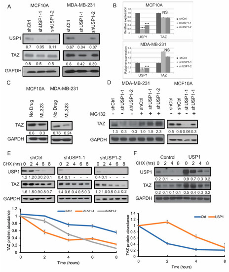 USP1 acts as a post-translational modifier of TAZ. (A) Immunoblot analysis for USP1 and TAZ expression in USP1 knockdown MCF10A and MDA-MB-231 cells. GAPDH was used as a loading control. (B) Relative mRNA expression of USP1 and TAZ in USP1 knockdown MCF10A and MDA-MB-231 cells. (C) Immunoblot analysis for TAZ expression in MCF10A and MDA-MB-231 upon treatment with 15µM ML323. GAPDH was used as a loading control. (D) Immunoblot analysis for TAZ expression in USP1 knockdown MCF10A and MDA-MB-231 cells with MG132treatment. GAPDH was used as a loading control. (n = 2) (E) Immunoblot analysis for USP1 and TAZ in USP1 knockdown MDA-MD-231 cells with CHX treatment at various time points. GAPDH was used as a loading control. (n = 3) (F) Immunoblot analysis for USP1 and TAZ expression in USP1 overexpressing MCF7 cells with CHX treatment at various time points. GAPDH was used as a loading control. (n = 2) Data are shown as the mean ± SD. Unpaired two-tailed student t-test: * p < 0.05, ** p < 0.01, *** p < 0.001. NS: no significance. Immunoblots were quantified and normalized to GAPDH.