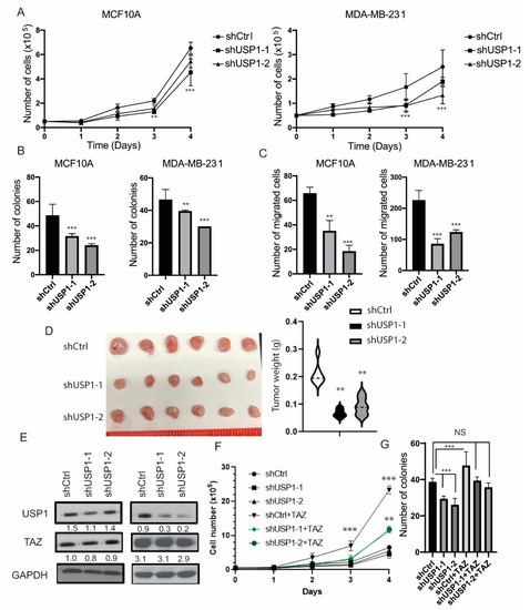 Many studies have shown that TAZ promotes the growth of non-transformed and transformed mammary epithelial cells [32,33]. Therefore, to assess how the loss of function of USP1 affects cell proliferation, we knocked-down USP1 using two independent shRNAs targeting USP1 in MCF10A and MDA-MB-231 cells. USP1 depletion reduced cell proliferation in both MCF10A and MDA-MB-231 cell lines (Figure 4A). Furthermore, the knockdown of USP1 corresponded to a reduction in clonogenicity and cell migration (Figure 4B,C). To determine the effects of knockdown USP1 in vivo, we injected shCtrl or shUSP1 MDA-MB-231 cells into the mammary fat pad of SCID mice. We found that USP1 knockdown cells had a significant reduction in tumor growth compared to control cells, indicating that USP1 loss reduces cell growth both in vitro and in vivo (Figure 4D).