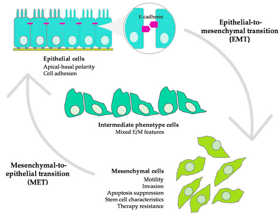 Most cancer-related deaths are due to metastasis, a complex process in which cancer cells are able to disseminate from a primary tumor to grow at distant secondary sites. In epithelial-derived carcinomas, cancer cells acquire the ability to invade and metastasize as a result of epithelial-to-mesenchymal transition (EMT), a cellular program that was firstly described in embryonic development [2,3,4]. During EMT, epithelial cells undergo phenotypic transformation into mesenchymal cells, due to the loss of apical-basal polarity, loss of cell junctions, and the reorganization of the actin cytoskeleton, which in turn causes the acquisition of migratory and invasive capabilities [1]. EMT has also been linked to apoptosis suppression and resistance to chemotherapy and immunotherapy, as well as the acquisition of stem cell characteristics, conferring selective advantage to cancer cells [5,6,7,8,9,10]. EMT is not an irreversible process and the resulting mesenchymal cells can revert to epithelial phenotype by mesenchymal-to-epithelial transition (MET) [4]. Indeed, MET usually happens when cancer cells reach secondary sites. They revert to an epithelial phenotype to enhance cell adhesion to the substrate in the distant organ and form metastasis. In a tumor, cancer cells usually execute an incomplete EMT program. Therefore, EMT is not a binary process but there are different intermediate states [11,12] that are needed for the metastatic colonization [13,14]. This phenotypic plasticity allows cancer cells to metastasize and seed new tumors at distant sites [15]. Indeed, there is a variety of intermediate cell phenotypes between epithelial and completely mesenchymal states. This is known as ‘epithelial–mesenchymal plasticity’ (EMP) and describes the ability of cells to adopt mixed epithelial/mesenchymal (E/M) features and to interconvert between both phenotypic states (Figure 1).