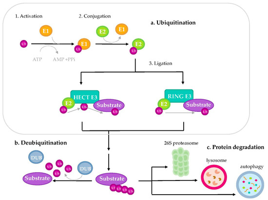 Ubiquitination cascade involved in targeted protein degradation. (a) Ubiquitination process. 1. Activation: ubiquitin (Ub) molecule is activated by the ubiquitin-activating enzyme (E1) in an ATP-dependent manner. 2. Conjugation: the ubiquitin-conjugating enzyme (E2) transfers the activated ubiquitin to the ubiquitin-ligase enzyme. 3. Ligation: the ubiquitin-ligase (E3) responsible for transferring the ubiquitin to the target substrate. E3 ligases can be classified in two major types, Homologous to E6-associated Protein C-terminus (HECT) E3 or Really Interesting New Gene (RING) E3, which differ in the mechanism used to transfer the ubiquitin (b) Deubiquitination: ubiquitin moieties can be removed from substrate proteins by deubiquitinase enzymes (DUB); (c) Protein degradation: ubiquitinated proteins are degraded by the proteasome, lysosome or autophagy.