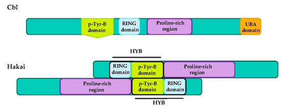 The E3 ubiquitin-ligase Hakai (also named Cbl-like-1 or Cbll1) was firstly identified as a RING-containing E-cadherin-binding protein that resembled the Cbl family [100]. However, Hakai is not a typical Cbl protein as it has different domains and mechanisms when it binds to pTyr residues in the target substrate [53]. Hakai possesses three different motifs: an N-terminal classic RING domain, a short pTyr recognition sequence, and a proline-rich domain in the C-terminal region, domains that are also harbored by the Cbl protein [100]. The RING-domain is directly adjacent to the HYB-domain, allowing the positioning of E2 and ubiquitin close to the pTyr residues in the substrate. Moreover, the mechanism of pTyr substrate binding is different between Hakai and Cbl, not being true homologues [25]. HYB-domain consists in a homodimer that forms a structurally different interface. Each monomer contains two zinc-finger domains between residues 106–148; an N-terminal RING domain followed by a short pTryrB regions that incorporate an atypical zinc-finger motif. Both motifs are important for dimerization [53]. For substrate recognition, the antiparallel dimerization of two monomers of Hakai is required. HYB-domain is responsible and critical for the interaction with targets, while the deletion of the RING-domain or the pTyr-domain deletion did not dramatically affect the association [25,53,163].