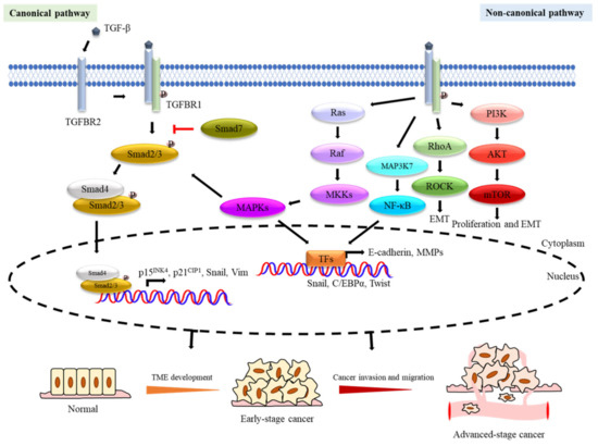 Transforming growth factor-β (TGF-β) signalling pathways in tumorigenesis. The dual roles of TGF-β signalling pathways have been demonstrated in tumorigenesis. TGF-β is a tumour suppressor in TME development of early-stage cancer and a tumour promoter in malignancy processes of advanced-stage cancer. Schematic diagramme (above) showing TGF-β signalling and its role in cancer tumorigenesis and progression as well as tumour suppression. TGF-β binds to TGFBR2 which then complexes with TGFBR1 to activate downstream signalling. TGF-β can activate both Smad-dependent canonical and Smad-independent non-canonical signalling cascades. The TGF-β activated TGFBR1 phosphorylates the Smad2/3 complex which then associates Smad4, before translocating to the nucleus to regulate the transcription of different targeted genes involved in tumour suppression during tumorigenesis (e.g., p15INK4b and p21Cip1), as well as tumour progression (e.g., Snail and Vimentin). The Smad-dependent TGF-β canonical signalling pathway can also be antagonised by Smad7 through inhibiting the binding of the Smad2/3 complex with Smad4. In the Smad-independent non-canonical signalling cascades, the activated TGFBR1/2 receptors induce downstream signalling through the Ras/Raf/MAPKs (JNK/p38/ERK), PI3K/AKT, MAP3K7(TAK1)/NF-κB, and Rho family of small GTPase-dependent signalling pathways. The TGF-β activated JNK/p38/ERK-MAPKs also crosstalk with Smad2/3/4 to modulate downstream signalling to influence cancer development. The Rho family of small GTPase-dependent signalling pathways (e.g., Rho/ROCK) are involved in epithelial–mesenchymal transition (EMT). The activated PI3K/AKT pathway induces mTOR to promote cell proliferation and EMT. The TGF-β signals also activate NF-κB signalling to modulate inflammatory response.