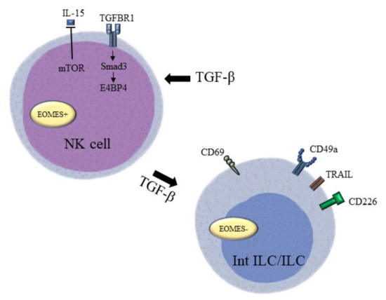 - Cortez, V.S.; Ulland, T.K.; Cervantes-Barragan, L.; Bando, J.K.; Robinette, M.L.; Wang, Q.; White, A.J.; Gilfillan, S.; Cella, M.; Colonna, M. SMAD4 impedes the conversion of NK cells into ILC1-like cells by curtailing non-canonical TGF-β signaling. Nat. Immunol. 2017, 18, 995–1003. [Google Scholar] [CrossRef] [PubMed]