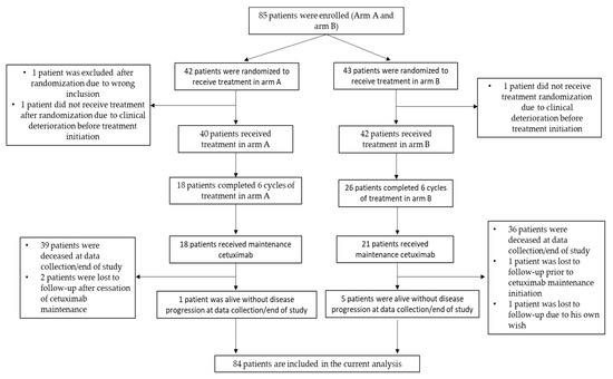 In total, 85 patients with relapsed or metastatic SCCHN were randomized in a 1:1 ratio to cetuximab and 5-FU/cisplatin or carboplatin (arm A, n = 42) vs. cetuximab and paclitaxel/carboplatin (arm B, n = 43). The intention-to-treat (ITT) cohort included all patients who were randomized to a study treatment, whereby patients were analyzed according to the group to which they were randomized. The PFS curves in both treatment arms were compared using a log rank test at a one-sided significance level of 0.1. The log rank test was stratified by the factors considered during randomization (previous chemotherapy and tumor site). In addition, the primary and the secondary endpoints were also analyzed using the log-rank without any stratification. Univariate Cox proportional hazard methods were used to estimate the hazard ratio (and corresponding 95% CI) between both treatment arms. Furthermore, a multivariable Cox proportional hazard method was used to investigate the impact of possible prognostic factors (e.g., disease characteristics) on the treatment effect. The analysis of the assumptions for each Cox regression model and the overall score from each model concluded no violation against the proportional hazards (OS, p-value = 0.33, PFS, p-value = 0.48, and TTF, p-value = 0.65). Descriptive statistical methods were used to summarize the safety variables in both treatment arms. A Chi-square test was used to compare the response rates between the two treatment arms. All analyses were performed using the Statistical Package for Social Sciences (SPSS) version 25 (IBM Corp., Armonk, NY, USA,) and R version 3.61 (R Foundation for Statistical Computing, Vienna, Austria. URL http://www.R-project.org/).