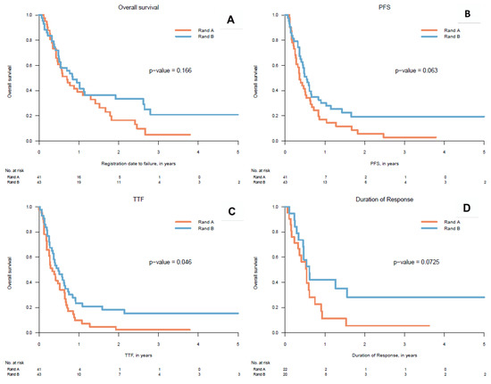 Kaplan Meier curves, rand A: Randomization Arm A, rand B: Randomization Arm B, (A) OS: Overall Survival, (B) PFS: Progression-Free Survival, (C) TTF: Time to Treatment Failure, (D) Duration Of Response.