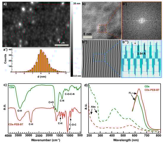 Physicochemical characterization of the CDs-PEG-BT. Atomic force microscopy (AFM micrograph (a) and size distribution (a’) of the CDs-PEG-BT. HRTEM micrograph (b), fast Fourier transform (FFT) (b’), inverse fast Fourier transform (IFFT) (b’’), and d-spacing calculation (b’’’) of the CDs-PEG-BT. FTIR spectra of the CDs-PEG-BT compared with the bare CDs (c). Absorption and emission spectra excited at 550 nm of an aqueous dispersion of CDs-PEG-BT and the bare CDs (d).