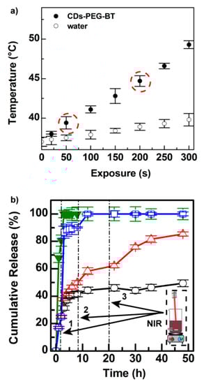 The light-triggered photothermal effect of CDs-PEG-BT is reported in Figure 3a. The red-emitting CDs core possesses good photothermal conversion (25.8%), whereas the existence of possible bias in NIR photothermal conversion due to the presence of PEG shell was ruled out since the outstanding increase in temperature was observed under 810 nm laser diode irradiation (Figure 3a).