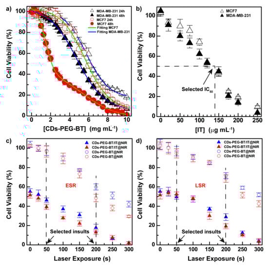 3-(4,5-dimethylthiazol-2-yl)-5-(3-carboxymethoxyphenyl)-2-(4-sulfophenyl)-2H-tetrazolium (MTS) assay on MCF7 and MDA-MB-231 cell lines. Cytocompatibility of CDs-PEG-BT on MCF7 and MDA-MB-231 cells after 24 and 48 h incubation. (a) dose–response or bi-dose–response fitting (R2 > 0.997) is reported in green and blue for MCF7 and MDA-MB-231 cells, respectively. Anticancer effect of CDs-PEG-BT/IT as function of equivalent amount of drug; (b) NIR-triggered anticancer photothermal effect of either the CDs-PEG-BT/IT and equivalent amount of the bare CDs-PEG-BT on MCF7 (red) and MDA-MB-231 (blue) cells at the IC50 calculated in Figure b (IT = 140 µg mL−1 ≡ CDs-PEG-BT = 590 µg mL−1) and low power density (2 W cm−2); (c–d): early stage response (ESR) is evaluated before the treatment (c), whereas long stage response (LSR) is evaluated 20 h after the photothermal insults (d). Data shown as mean ± s.e.m. (n = 3, two independent replicates).