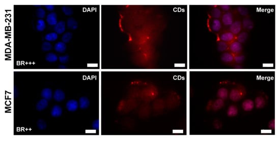 The ability of CDs-PEG-BT/IT to enter cancer cells by biotin receptors (BR) and act as imaging agent in FL imaging applications was established by fluorescence microscopy on both cell lines considered and after 4 h of incubation. Figure 5 shows that the nanosystem can efficiently enter both MCF7 and MDA-MB-231 and diffuse into cells. A clearly visible red fluorescence ascribable to CDs-PEG-BT is detected inside nuclei, the cytosol, and inside endosomes.