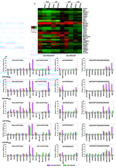 Particularly, noteworthy is the overlapping patterns of gene expression observed between cell response at ESR and LSR, even if the amount of gene overexpressed in response to the selected insults appeared attenuated (Figure 7a,b). This trend can be explained considering the recovery of cell growth after the postincubation period of 20 h. In particular, for MCF7 cells treated with CDs-PEG-BT, with and without NIR laser exposure, insults failed to produce a significant activation of RCD mechanisms, according to cell viability data (Figure 4d).