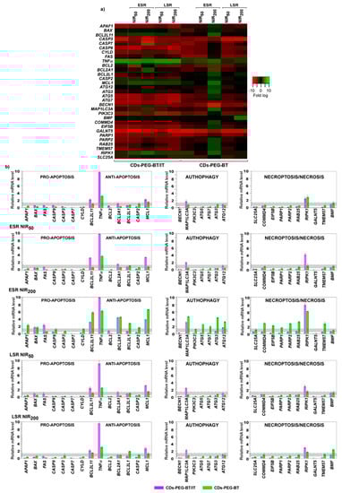 A comparison between cells treated with CDs-PEG-BT and unexposed MDA-MB-231 revealed a similar transcriptional profile. Of the 31 cell death pathway-focused genes, only 2 showed a 2-fold difference in gene expression in CDs-PEG-BT-treated cells with negligible effects, if any, on the activation of a death response (Figure 6a,b). As expected, MDA-MB-231 cells exposed to CDs-PEG-BT/IT showed different gene expression pattern when compared with the control. Among the gene set analyzed, we found at least 1.5-fold difference in gene expression of 23 genes between cells treated with CDs-PEG-BT/IT and controls. Upregulation was observed in 11 genes, whereas 12 genes underwent downregulation. Cells treated with CDs-PEG-BT/IT showed a number of genes associated with apoptotic cell death exhibiting significant differential expression. In particular, among 11 upregulated genes, 5 encode for proapoptotic members and include BCL2L11, CASP3, CASP7, CYLD, and TNFα. Additionally, a reduction in the gene expression levels of prosurvival factors as BCL2, BCL2A1, and BCL2L1 occurred. Conversely, the mRNA levels of autophagic- and necrotic-related genes were reduced since the majority of downregulated genes falls in these pathways. These results suggest the activation of the apoptotic cell death pathway in MDA-MB-231 exposed to CDs-PEG-BT/IT, which is responsible for the reduction in cell viability observed in Figure 4b. Because the cell response to photothermal insults also depends on the amount of energy absorbed by internalized CDs-PEG-BT and CDs-PEG-BT/IT nanoparticles, these effects were evaluated in MDA-MB-231 cells treated for 50 and 200 s at 2 W cm−2 laser irradiation. At ESR, a few changes in the expression profiles occurred in response to 50-s laser treatment for the cells exposed to CDs-PEG-BT (Figure 6a,b), without hinting at the activation of death response altering MDA-MB-231 viability (Figure 4c). The reverse transcription -quantitative PCR (RT-qPCR )analyses also showed that in response to 200-s laser treatment the mRNA levels of 10 genes were at least 1.5-fold higher. In particular, it emerges a concurrent upregulation of apoptotic- (BCL2L11, and CASP3), autophagic- (ATG12, ATG3, BECN1, and MAP1LC3A), and necroptotic (TMEM57, BMF, GALNT5, and RIPK1)-related genes (Figure 6a,b). It is well recognized that different cell death mechanisms may simultaneously occur in cells exposed to certain stimuli []. Thus, considering the magnitude of the measured upregulations, a concurrent and slight activation of different cell-death programs could be hypothesized under this condition so as to impair cell viability (Figure 4c). Additionally, mutually transforming commitment toward a specific pathway could be also supposed because of the interconnection of the herein analyzed members in death signaling pathways [,,].