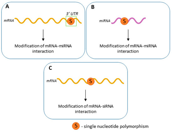 The consequences of SNPs that can affect RNAi therapy (by modifying mRNA-miRNA interactions (A,B), and by modifying mRNA-siRNA interactions (C).