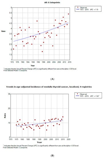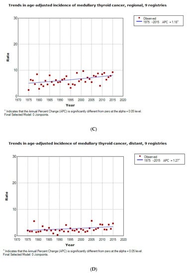 Demographics of the included patients are summarized in Table 1. A total of 2533 patients with MTC were identified from the SEER database between the years 1973–2016, with a mean age of 60.1 ± 10.7 years. There has been a statistically significant increase in age-adjusted localized MTC by 1.19% per year including all stages from the years 1973–2015 (Figure 1A). When accounting for the extent of the disease, localized disease in this group of the patient has increased by 1.04% (Figure 1B), regional MTC increased by 1.18% per year (Figure 1C), and the incidence of MTC with distant metastasis increased by 1.27% per year (Figure 1D) over the past 43 years.