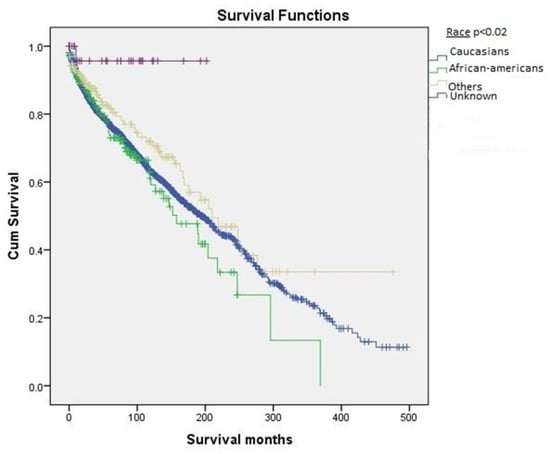 Table 1 shows the demographic distribution and survival based on the reported variables. Females outnumbered males in both number (58.6% vs. 41.4%) and overall survival (239.0 ± 7.5 vs. 180.7 ± 8.4 months) (Figure 2). In terms of racial distribution, Caucasians represented the largest cohort (n = 2172, 85.7%) followed by African-Americans (n = 177, 7.0%), and other minority races (Native Americans, Asian/Pacific islanders, n = 156, 6.2%). The survival based on racial distribution was highest in Asians/Native Americans, followed by Caucasians (Figure 3). When the patients were divided into different age groups, younger patients had better survival than older patients.