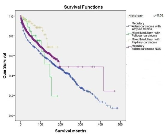 In the histopathological subgroup analysis, MTC NOS (n = 1704, 67.3%) was the most common variant with the best survival followed by MTC with an amyloid stoma (n = 702, 27.7%). MTC with the papillary variant (n = 89, 3.5%) and MTC with follicular variant (n = 38, 1.5%) were less common and also showed worse survival, respectively. This difference in survival based on histopathological subtype was statistically significant (p < 0.01) (Figure 4).