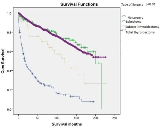 Patients who underwent total thyroidectomy had the best survival (165.3 ± 2.7 months), followed by patients who had lobectomy with or without ipsilateral thyroidectomy (162.1 ± 7.1 months), than those who had a subtotal thyroidectomy (122.2 ± 14.4 months). Patients who did not receive surgery had the poorest survival (47.3 ± 5.3 months) (Figure 5).