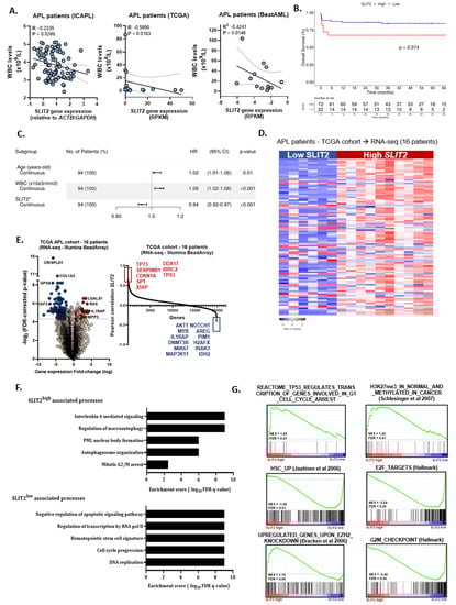 Clinical role of SLIT2 in acute promyelocytic leukemia (APL). (A) Correlation analysis of SLIT2 expression and white blood cell count in APL patients included in the International Consortium of Acute Promyelocytic Leukemia (IC-APL) cohort (left panel), in the TCGA cohort (middle panel) and in the BeatAML study (right panel). The r and p-values are indicated on the figure, Spearman correlation test. (B) The probability of overall survival in APL patients according to the SLIT2 expression. Survival curves were estimated using the Kaplan–Meier method and the log-rank test was used for comparison. (C) Multivariate Cox model for overall survival. Differential expression of SLIT2 can categorize APL patients into different risk groups. (D) Heatmap of differentially expressed genes (supervised clustering) in APL samples from TCGA cohort dichotomized based on the SLIT2 gene expression (dichotomization point: expression below 1; groups: high (n = 10) and low (n = 6) expression). (E) Volcano plot comparing APL patients with low SLIT2 expression versus APL patients with high SLIT2. Fold change was set at 2 for upregulated and downregulated gene expression. Significance was set at a corrected FDR < 0.05. A total of 232 genes were downregulated (blue) and 108 were upregulated (red). (F) Gene ontology (GO) and (G) gene set enrichment analysis (GSEA) on a ranked gene list based on the leading-edge genes for SLIT2 expression in 16 de novo APL patient samples from TCGA study. Genes were ranked based on Pearson correlation using the SLIT2 gene expression. Normalized enrichment score (NES) and false discovery rate (FDR) was used to determine significance.