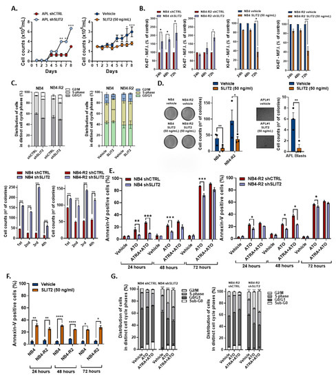 Cell proliferation: NB4 and NB4-R2 cells were treated with SLIT2 peptide (50 ng/mL) for 24, 48, and 72 h. For SLIT2-silenced APL cell lines, cells were treated twice with thymidine (2 mM) for 18 h to induce cell cycle arrest at the G1/S boundary. Cells were subsequently seeded in six-well plates and 1 million cells were collected and fixed with 70% ethanol at distinct timepoints: 24, 48, and 72 h, and stored at −20 °C. For both conditions (SLIT2 treatment and shSLIT2 cells), Ki-67 staining was performed following the manufacturer’s instructions (Ki-67 PE clone SolA15; BioLegend, San Diego, CA, USA). Next, the mean of fluorescence intensity (MFI) was obtained by flow cytometry standard techniques using a FACSCantoII instrument (Becton-Dickison, Franklin Lakes, NJ, USA). IgG isotype was used as a negative control for each condition. In parallel, cells were seeded at a density of 1 × 104 cells/mL in 10 cm dishes and the cell number was counted daily for seven days.