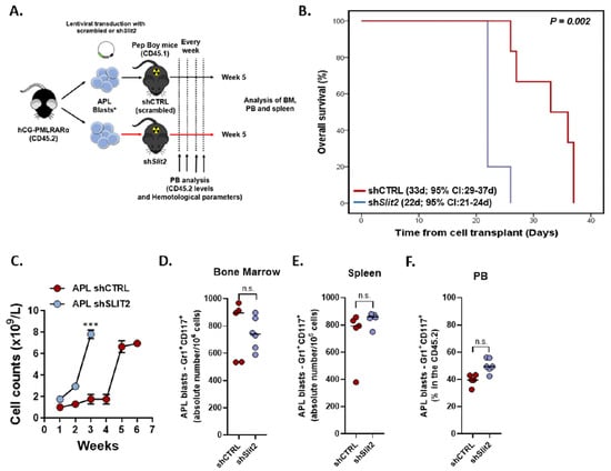 SLIT2 knockdown induces APL clonal expansion and reduces overall survival in vivo. Overview of the mouse model for APL generation. (A) Schematic representation of the generation of the isogeneic mouse model for APL engraftment using blasts from the hCG-PMLRARA mice (CD45.2) transplanted in Pepboy mice (CD45.1). (B) The probability of overall survival in mice transplanted with murine APL blasts transduced with shSlit2 and scrambled as a control (shCTRL). Survival curves were estimated using the Kaplan–Meier method and the log-rank test was used for comparison. (C) Weekly bleedings of mice were used to determine the leukocyte count (*109/L) and monitor disease progression. At sacrifice, APL blasts and cells from Pepboy mice were analyzed by flow cytometry using markers against CD117, Gr1, CD16/32, and CD34, as indicated (inside the population CD45.2+ and lineage negative). Scatter plots showing engraftment of donor APL blast cells (D) in bone marrow (BM), (E) spleen (percentual of engraftment and spleen weight), and (F) peripheral blood (PB) of transplanted mice at sacrifice. Data were expressed as median values. *** indicates p < 0.001; n.s. indicates not significant.