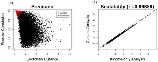 Evaluation of negative control normalization based on precision and scalability: (a) scatterplot of Kinase suppressor of Ras 1 (KSR1)-depleted wells (red dots) and individual gene depletions from the siGenome library (black dots) based on Euclidean distance (arbitrary distance units) and Pearson correlation similarity metrics and (b) scatterplot showing correlation of the Euclidean distance metrics after normalizing to the nontargeting control wells using the ranking of previously validated kinome hits calculated from the kinome only analysis (x-axis) vs. the entire-genome screen analysis (y-axis).