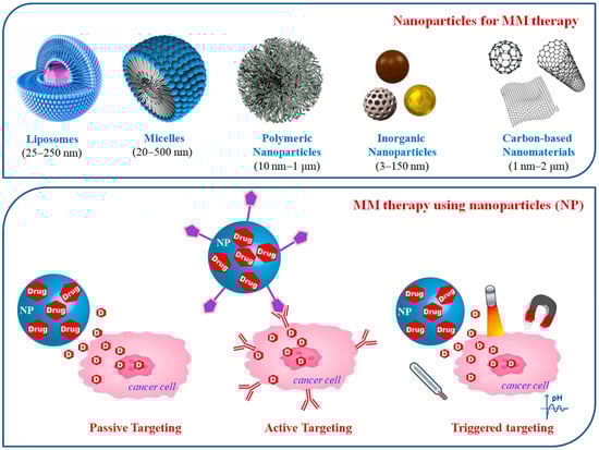 The above reported different therapeutic approaches have been investigated using different classes of nanoparticles originating from organic or inorganic sources such as liposomes, micelles, and polymers, inorganic nanoparticles, and carbon-based nanomaterials—all with different shapes, sizes, and degrees of surface functionalization. For this purpose, different polymers were developed to formulate drug delivery systems approved as safe by the US-FDA and EU regulatory agencies. Poly(lactic-co-glycolic) acid (PLGA), polyethylene glycol (PEG), chitosan, poly-(ethylene oxide)-block-poly-(α-benzyl carboxylate ε-caprolactone; PEO-b-PBCL), and poly(ethylene imine (PEI) have gathered considerable attention due to their favorable properties. Some of the most attractive characteristics are their biodegradability and biocompatibility; the possibility to be combined with both hydrophilic and hydrophobic small molecules or macromolecules; efficient protection against degradation; sustained drug release; the possibility of surface functionalization to improve interaction with biological materials; and the ability to target specific organs, cells, or proteins []. The recent advances in the use of nanopharmaceutics for MM treatment (Figure 1), which have been classified for the different classes of the investigated nanoparticles, are reported in the following paragraphs and summarized in Table 1.
