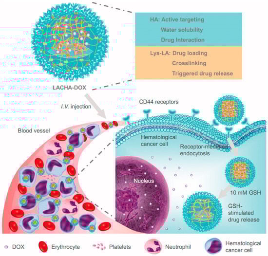 Doxorubicin (DOX)-encapsulated lipoic acid-crosslinked hyaluronic acid nanoparticles (LACHA) for the treatment of CD44 over-expressed hematologic malignancy. Reproduced from Ref. [].