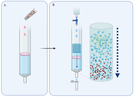 Larger particles take a more direct path through the gel and elute first. (A) Sample is layered onto column prepared with gel matrix. (B) With continuous addition of wash buffer, separation of the sample according to size occurs along the column.