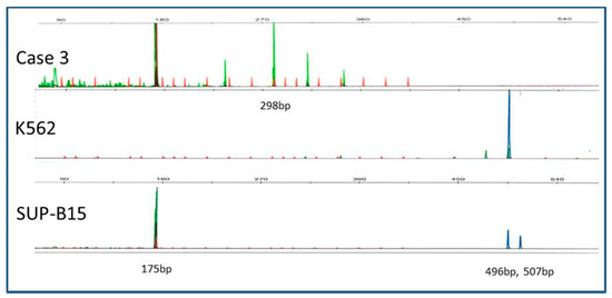 Following validation of the rapid assay for detection of Ik-6, Ik-8 and C-terminal indels, 17 cases of adult ALL were investigated (Table 1). These included 12 males and 5 females with a median age of 43 (from 20 to 77) years old. Immunophenotypically, 15 were classified as precursor B-cell and 2 with precursor T-cell ALL. The average blast percentage in the tested specimens was 64.1 ± 30.1 (95% CI: 49.1–79.1%). The B-ALL blasts all expressed cytoplasmic (c) cCD79a, CD34, TDT and negative for cCD3 and myeloperoxidase (cMPO). For T-ALL, they expressed cCD3, CD34, TdT, and were negative for cMPO. The t(9;22)(q34;q11) were detected in 2 B-ALL patients (2/17) and further confirmed to have BCR-ABL1 p190 transcripts.