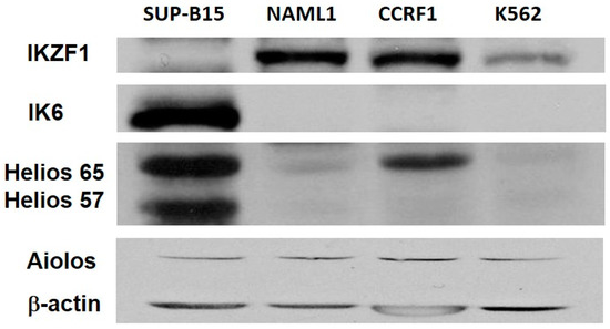 Detection of IKZF1 and IKZF family proteins in leukemic cell lines. Western blot analysis of four leukemia cell lines for IKZF1 full protein (top), Ik-6 (2nd from top), both with an anti-IKZF1 antibody, as well as Helios (anti-IKZF2 antibody), Aiolos (anti-IKZF3 antibody), and β-actin. The expected sizes of the proteins are IKZF1: 57.5 kDa, Ik-6: 38.2 kDa, Helios/IKZF2: 65 and 57 kDa, Aiolos/IKZF3: 70 kDa, and β-actin: 42 kDa (Figure S1).