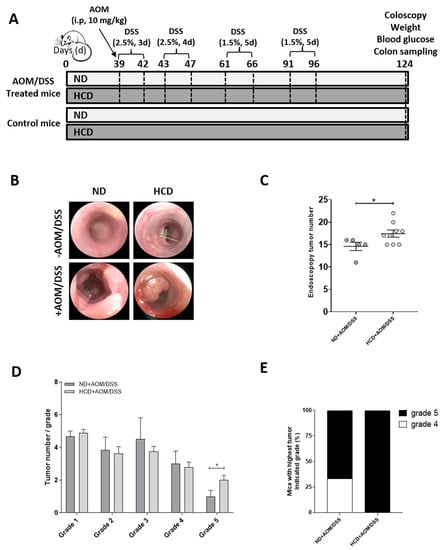 Tumor developments were assessed using a high-resolution Karl Storz colonoscope (1.9 mm outer diameter; Tuttlingen, Germany) at the end of protocol (day 124). Mice were anesthetized using isoflurane for the duration of the procedure and closely monitored. For tumors assessment we followed the method described by Becker et al. [44]. Tumors observed from colonoscopy videos were counted, measured and categorized into size: grade 1 (very small but detectable tumor), grade 2 (tumor covering up to one eighth of the colonic circumference), grade 3 (tumor covering up to a quarter of the colonic circumference), grade 4 (tumor covering up to half of the colonic circumference) and grade 5 (tumor covering more than half of the colonic circumference).
