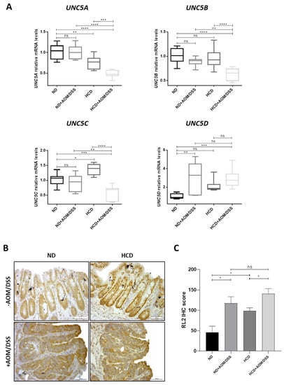 We then examined the colonic expression of UNC5A, UNC5B, UNC5C and UNC5D by RT-qPCR analysis (Figure 2A). Surprisingly and in disagreement with their tumor suppressor gene status, we did not observe any difference in the expression of UNC5A, UNC5B, and UNC5C between control group (ND) and AOM/DSS group under Normal Diet (ND + AOM/DSS) and UNC5D was found to increase (Figure 2A). These results suggest that downregulation of these family of genes is not necessary for CRC emergence. In contrast, our results showed a marked decrease in the level of UNC5A, UNC5B and UNC5C transcripts in the colon of AOM/DSS treated mice fed HCD (Figure 2A, compare ND or ND + AOM/DSS vs. HCD + AOM/DSS) strongly suggesting that nutrition is involved in the epigenetic downregulation of these genes that might occur during the progression of CRC.