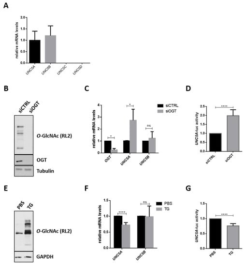 To evaluate the role of O-GlcNAcylation in the epigenetic downregulation of the UNC5 family, we first examined the expression of UNC5A, UNC5B, UNC5C and UNC5D transcripts in the human colon cancer cell line HCT116 (Figure 3A). We detected significant levels of only UNC5A and UNC5B transcripts. We then investigated the effect of the knock-down of OGT by siRNA on the levels of the UNC5 family members in this cell line. siOGT efficiency was checked at protein (Figure 3B) and mRNA level (Figure 3C) and we found that it induced a significant increase in UNC5A mRNA levels but had no effect on UNC5B (Figure 3C). Moreover, UNC5C and UNC5D transcripts remained undetectable upon OGT silencing (Decourcelle, A.; Dehennaut, V.; Université de Lille, CNRS, Inserm, CHU Lille, UMR9020-U1277—CANTHER—Cancer Heterogeneity, Plasticity and Resistance to Therapies, F-59000 Lille, France. Personal observation, 2020.). This first observation supports our hypothesis that O-GlcNAcylation is only involved in the regulation of the expression of UNC5A but not of the other members of the family. mRNA amounts can be regulated either at the transcriptional level or at the post-transcriptional level (mRNA stability). In order to investigate whether siOGT-induced increase of UNC5A expression was due to transcriptional regulation, we used a previously described UNC5A promoter activity reporter plasmid [36,37] in luciferase assay. As shown in Figure 3D, siOGT caused a 2-fold induction of the UNC5A promoter activity correlated with a decrease in O-GlcNAcylation levels (Figure 3B). Inversely, treating HCT116 cells with the potent OGA inhibitor Thiamet G (TG) induced an O-GlcNAcylation increase (Figure 3E) correlated with a drop of 25% in UNC5A mRNA levels (Figure 3F) and promoter activity (Figure 3G). In contrast, Thiamet G treatment has no effect on UNC5B mRNA levels (Figure 3F). Taken together, these data demonstrate that O-GlcNAcylation is involved in the regulation of the transcription of colonic UNC5A.
