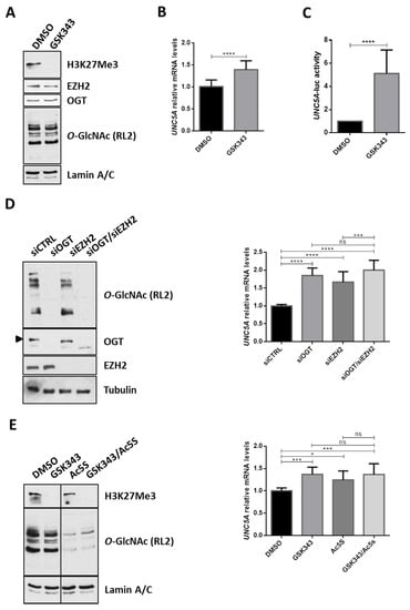EZH2 and OGT act together to repress the transcription of UNC5A in colon cancer cells. (A,B) HCT116 cells were treated with the EZH2 inhibitor GSK343 (5 µM final in DMSO (Dimethyl sulfoxide)) for 48 h. (A) Treatment efficiency was ensured by WB analyses of H3K27Me3 levels from chromatin-bound proteins extracts. EZH2, OGT and O-GlcNAcylation (RL2) levels were also assessed. Lamin A/C were used as a loading control. Data shown are representative of three independent experiments. (B) mRNA expression level of UNC5A was assessed by RT-qPCR. Values were normalized to RPLP0. Data shown are the average ± SD of three independent experiments. **** p < 0.0001: unpaired t-test. (C) Cells were transfected with 200 ng of an UNC5A promoter activity reporter plasmid and 25 ng of β-galactosidase reporter. Thus, 6 h later, cells were treated with GSK343 (5 µM final in DMSO) for 48 h. UNC5A-luciferase activity was determined as described in the experimental procedures section. Data shown are the average ± SD of three independent experiments. **** p < 0.0001: unpaired t-test. (D) HCTT116 cells were transfected either with non-target siRNA control (siCTRL), OGT siRNA (siOGT), EZH2 siRNA (siEZH2) or with a combination of siOGT and siEZH2 for 72 h. Cells were harvested either for total proteins or RNA extraction. Left panel: WB analyses were performed using the indicated antibodies. Data shown are representative of five independent experiments. Right panel: mRNA expression level of UNC5A was assessed by RT-qPCR. Values were normalized to RPLP0. Data shown are the average ± SD of five independent experiments. ns: non-significant, *** p < 0.001, **** p < 0.0001: Bonferroni’s multiple comparisons test. (E) HCTT116 cells were treated with the EZH2 inhibitor GSK343 (5 µM final in DMSO) or the OGT inhibitor Ac5S-GlcNAc (50 µM final in DMSO) alone or in combination. Cells were harvested either for total protein or RNA extraction. Left panel: WB analyses of Lamin A/C, H3K27Me3 and O-GlcNAcylation levels from chromatin-bound proteins extracts. Data shown are representative of four independent experiments. Right panel: amount of UNC5A transcripts was assessed by RT-qPCR. Values were normalized to RPLP0. Data shown are the average ± SD of four independent experiments. ns: non-significant, * p < 0.05, *** p < 0.001: Bonferroni’s multiple comparisons test.
