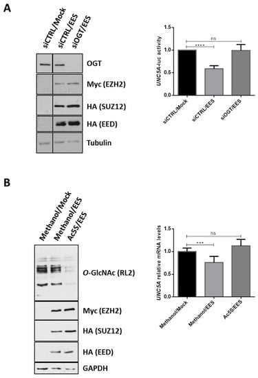 O-GlcNAcylation mediates the PRC2-mediated repression of UNC5A. (A) HCT116 cells were co-transfected with the core PRC2 complex (EES: Myc-EZH2, HA-EED, HA-SUZ12), 200 ng of plasmid encoding the luciferase reporter gene under the control of the UNC5A promoter and 25 ng of β-galactosidase in combination or not with siOGT. Left panel: transfection efficiency and OGT inhibition were checked by WB analyses with the indicated antibodies. Data shown are representative of three independent experiments. Right panel: luciferase activity was determined 48 h later and was normalized to β-galactosidase activity. Data shown are the average ± SD of three independent experiments. ns: non-significant, **** p < 0.0001: Bonferroni’s multiple comparison tests. (B) Cells were co-transfected with plasmids encoding the core PRC2 (EES: Myc-EZH2, HA-EED, HA-SUZ12), or with empty vectors (Mock). Thus, 24 h after transfection, cells were treated with the potent OGT inhibitor Ac5s-GlcNAc (50 µM final in methanol) for 24 h. Left panel: transfection efficiency and OGT inhibition were checked by WB analyses with the indicated antibodies. Data shown are representative of three independent experiments. Right panel: mRNA expression level of UNC5A was assessed by quantitative RT-PCR. Values were normalized to RPLP0. Data shown are the average ± SD of three independent experiments. ns: non-significant, *** p < 0.001: Bonferroni’s multiple comparison tests.