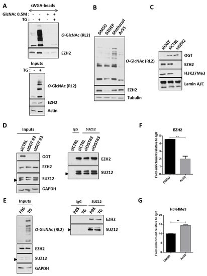 The EZH2 inhibitor, GSK343 (Sigma-Aldrich), was dissolved in dimethyl sulfoxide (DMSO) at 10 mM as stock solution and used at a final concentration of 5 µM. The EZH2 destabilizing agent, DZNEP (Sigma-Aldrich), was dissolved in DMSO at 10 mM as stock solution and used at a final concentration of 5 µM. The OGA inhibitor, Thiamet G (TG, Sigma-Aldrich), was dissolved in PBS at 1 mM as stock solution and used at a final concentration of 1 µM. The OGT inhibitor, Ac5S-GlcNAc (Ac5S, kind gift of GW. Hart and D. Vocadlo), was dissolved either in methanol or DMSO depending of their provenance at 50 mM as stock solution and used at a final concentration of 50 µM. Inhibitors were added to the cell culture medium for 24 h or 48 h.
