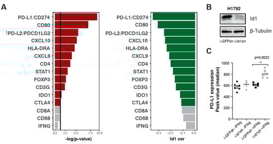 Id1 expression inversely correlates with the mRNA expression levels of several markers related to immune response. (A) Pearson correlation coefficients (green) and p-values (red) between Id1 mRNA expression levels and different genes associated with the immune system in LUAD patients. (B) Western blot for detection of Id1 protein in human H1792 cells infected with doxycycline-inducible shRNA lentiviral particles that target Id1, in comparison with the same cell lines infected with a control i-GFPsh. (C) Flow cytometry analysis showed a statistically significant increase in PD-L1 expression after exposure to IFN-γ for 24 hours when human H1792 tumor cells had Id1 inhibited (Median of peak value: H1792 +IFN-γ: i-GFPsh 610.0 [579.5–641.5], i-Id1sh 790.5 [734.0–874.5], p = 0.0022). The data are reported as the median with the interquartile range. ** p < 0.01.