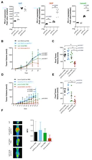 To define the synergistic effect of Id1 inhibition in tumor cells and PD-1/PD-L1 axis blockade in the in vivo setting, syngeneic models were generated by injection of our three KRAS-mutant murine LUAD cells (Id1sh-cells or pLKO-sc control cells) into the flanks of mice (n per group = 8). A significant decrease in tumor volume was observed in mice injected with Id1sh LLC cells that received anti-PD-1 agent compared with that seen in mice injected with Id1 or PD-1 inhibition alone or that seen in the control group; and, after day 14, p-values for the groups were as follows: Id1sh/DPBS p = 0.0384; pLKOsc/anti-PD-1 p = 0.0012; pLKOsc/DPBS p = 0.0017 (Figure 2B,C).
