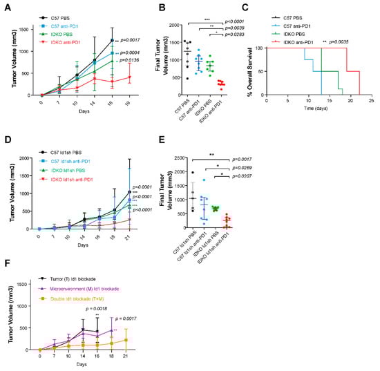 Next, we studied the impact of the combined blockade when both the host and the tumor cells lacked Id1 expression. The comparison between Id1-/- and Id1+/+ LLC Id1sh tumor-bearing mice (n per group = 8) showed that the lack of Id1 in both tumor cells and tumor microenvironment significantly potentiated the antitumor activity of anti-PD-1 therapy (Id1-/-/DPBS p = 0.0207; Id1+/+/anti-PD-1 p = 0.0269; Id1+/+/DPBS p = 0.0017) (Figure 3D,E).