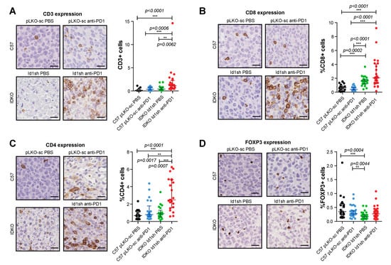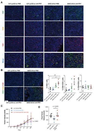 However, in this case, no significant changes related to CD4+ lymphocytes were observed (Figure 5A,B). These results indicate that lack of Id1 in both tumor cells and tumor microenvironment, along with the blockade of the PD-1/PD-L1 axis favors the infiltration of different immune cell populations into the tumor, specifically the presence of CD8+ T lymphocytes, which may justify the antitumor activity associated with the double blockade.