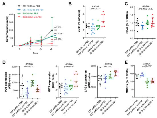 The antitumor activity observed after the Id1 and PD-1 blockade is mediated by CD8+ T cells. (A) Tumor growth of LLC (pLKO-sc or Id1sh) cells in mice (C57BL/6J or IDKO) treated with DPBS or anti-PD-1 for endpoint flow cytometry analysis (final tumor volume per group: Id1-/-/anti-PD-1: 28.04 [21.42–65.61] mm3; Id1-/-/DPBS: 123.3 [82.24–227.2] mm3, p < 0.0001; Id1+/+/anti-PD-1: 120.3 [70.97–148.1] mm3, p = 0.0029; Id1+/+/DPBS: 198.4 [122.6–223.8] mm3, p < 0.0001). (B) Flow-cytometric analysis of CD8+ T cells in tumors harvested at day 14. (C) Flow-cytometric analysis of CD4+ T cells in tumors harvested at day 14. (D) Flow-cytometric analysis of PD-1, GITR and LAG3 markers (expressed as mean fluorescence intensity on CD8+ T cells) in LLC tumor grown the same mice as in A. (E) Flow-cytometric analysis of MDSCs cells in tumors harvested at day 14. The data are reported as the median with the interquartile range. * p < 0.05, ** p < 0.01, *** p < 0.001, n.s. (not significant).