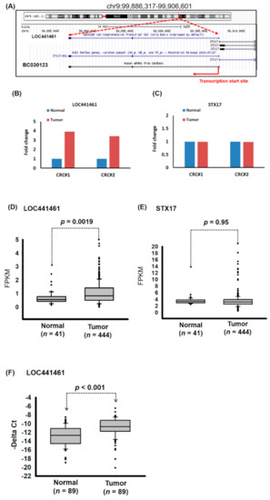 Abnormal expression of LOC441461 in human colorectal carcinoma (CRC). (A) Schematic representation of the location of LOC441461 in the human genome, as obtained from the website of the University of California, Santa Cruz (https://genome.ucsc.edu/). (B,C) Expression levels of LOC441461 and STX17 in the CRC samples and adjacent normal samples of two patients were determined using a microarray approach. (D,E) Expression levels of LOC441461 and STX17 were examined in human colorectal cancer samples obtained from The Cancer Genome Atlas (TCGA) database. Fragments per kilobase of transcripts per million was used to quantify the gene expression. (F) Expression levels of LOC441461 were examined using real-time (RT)-polymerase chain reaction (PCR) in CRC tissues and the corresponding normal tissues from 89 patients. The LOC441461 expression levels were statistically analyzed using Student’s t test. The difference was considered significant when p < 0.05.