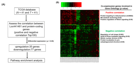 Identification of LOC441461-coexpressed genes through the TCGA database and pathway enrichment analysis. (A) Flowchart of identification of genes coexpressed with LOC441461 with significant differential expression (p < 0.05), as identified in CRC in the TCGA database. (B) Heat map of genes with significant expression (p < 0.05) in 41 CRC N-T pairs from TCGA database (left panel). The positively and negatively correlation genes were subjected to gene ontology analysis, and significantly involved pathways are displayed in the right panel.