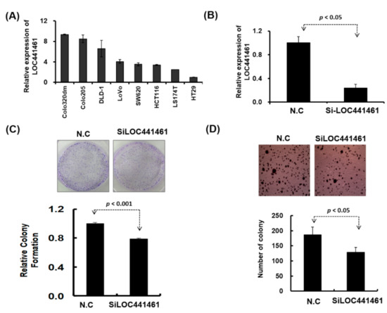The expression levels of LOC441461 in colon cancer tissues were analyzed using TCGA database or RT-PCR by employing Student’s t test. Cell proliferation, colony formation, soft agar assay, and migration–invasion experiments were performed in triplicate. The histograms present the mean values, and the error bars indicate the standard deviation. The difference was considered significant when p < 0.05.