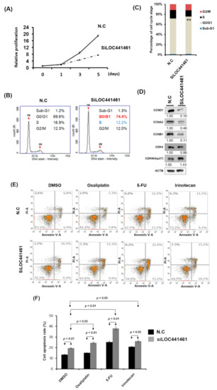 LOC441461 knockdown suppressed SW620 cell proliferation by inducing cell cycle arrest and apoptosis. (A) LOC441461 expression levels were knocked down with si-LOC441461 transfection in SW620 cells. Cell proliferation compared with the scrambled control was measured using the CellTiter-Glo One Solution assay at various time points (0, 1, 3, and 5 days). (B) Distribution of cells in three phases of the cell cycle was examined using the image flow cytometry assay. (C) Graph of each quantified phase. (D) Cell-cycle-related protein levels were examined using the Western blotting assay in SW620 cells with and without LOC441461 knockdown. (E,F) After exposure to 2 µg/mL oxaliplatin, 5-FU, or irinotecan for 48 h, cell apoptosis was examined using Annexin V assay, and the percentage of apoptosis was quantified in colon cancer cells with LOC441461 knockdown and in control cells. All the experiments were performed in triplicate, and these data were analyzed using Student’s t test. The difference was considered significant when p < 0.05. ** Indicates difference that is considered significant between the indicated groups p < 0.01.