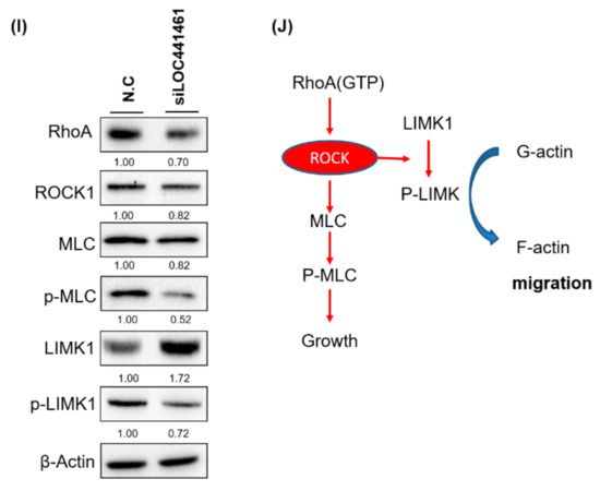 Our results revealed that LOC441461 knockdown suppressed colon cancer cell growth and motility. According to pathway enrichment analysis, LOC441461-coexpressed genes were significantly involved in regulating the small GTPase activity, cell shape, and cell cycle. Studies have reported that the Rho family of small GTPases regulates crucial cellular processes, including cytoskeletal dynamics and cell migration and growth [26,27]. Therefore, we suggest that LOC441461 knockdown suppresses cancer cell growth and motility by blocking RhoA/ROCK signaling in colon cancer. We further examined the RhoA/ROCK/MLC2 and RhoA/ROCK/LIMK signaling in DLD-1 cells with LOC441461 knockdown. As illustrated in Figure 5I, RhoA, ROCK, and MLC expression levels were reduced in the DLD-1 cells with LOC441461 knockdown. Our data also revealed that LOC441461 knockdown could suppress the phosphorylation of MLC and LIMK1 (Figure 5I and Supplementary Figure S8C). Furthermore, LOC441461 knockdown reduced the generation of cell membrane filopodia protrusions in the DLD-1 cells (Supplementary Figure S7A,B and Text S1). In the aforementioned cells, the amount of G-actin (monomer) increased, whereas that of F-actin decreased (Supplementary Figure S7C,D). In summary, our study is the first to report the involvement of a novel oncogenic lncRNA, namely LOC441461, in colon cancer growth and cell motility through the modulation of the RhoA/ROCK signaling activity (Figure 5J).