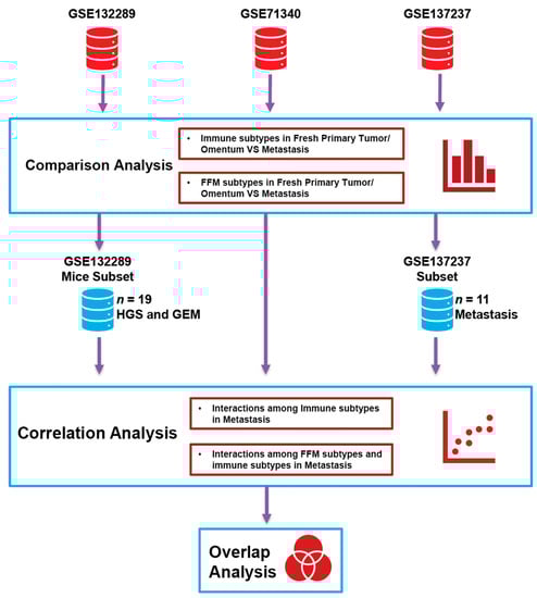 Transcriptomic data of GSE132289, GSE71340 and GSE137237were retrieved from the NCBI GEO database (https://www.ncbi.nlm.nih.gov/geo/) and processed with standardized protocols. Specifically, GSE132289 data includes 37 mouse samples (16 HGS, 3 GEMM, 9 cl, 9 normal omental tissues), 8 human samples; GSE137237 data contains 11 pairs of matched primary and metastases tumor tissue samples; and GSE71340 data contains 35 samples. Deconvolution, coexpression correlation and differential expression analysis were separately conducted in each dataset.